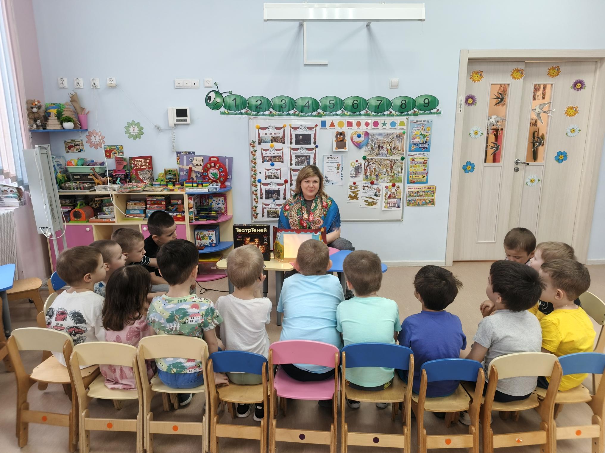 Особенно запомнился день, когда к нам в гости пришли родители. Они показали ребятам разные сказки, а также удивительный теневой театр. Дети с восторгом наблюдали за тем, как с помощью света и тени оживают знакомые персонажи. Мы обсудили, чем отличается кукольный театр от драматического, кто такие режиссёр, актёр, гримёр и почему без их труда спектакль невозможен.