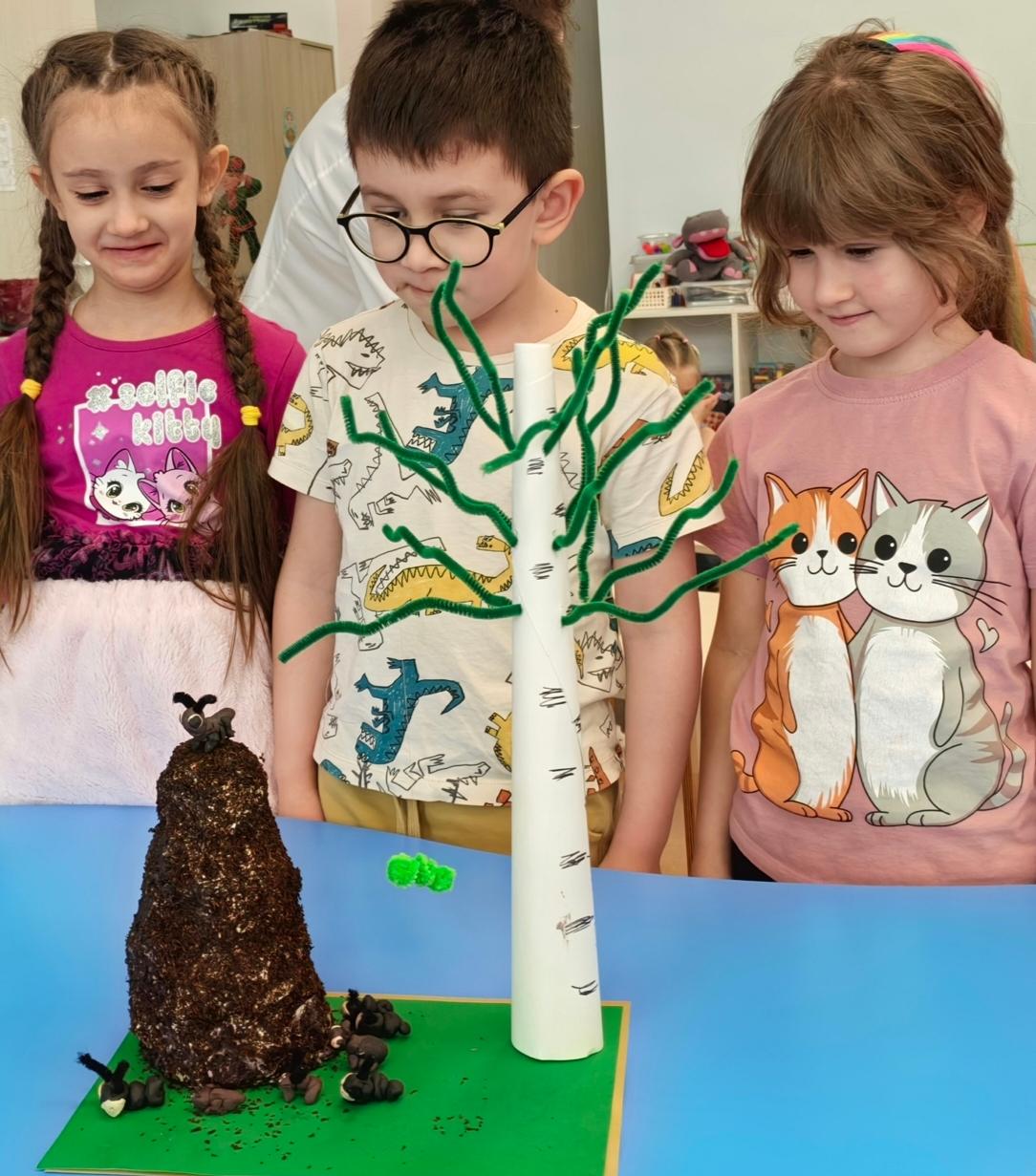 Поэтому ребята сделали совместную работу по сказке «Как муравьишка домой спешил». Муравейник сделан из обыкновенной пластиковой бутылки, клея, салфеток и чаинок. Муравьи из пластилина, а гусеница из синельной проволоки.