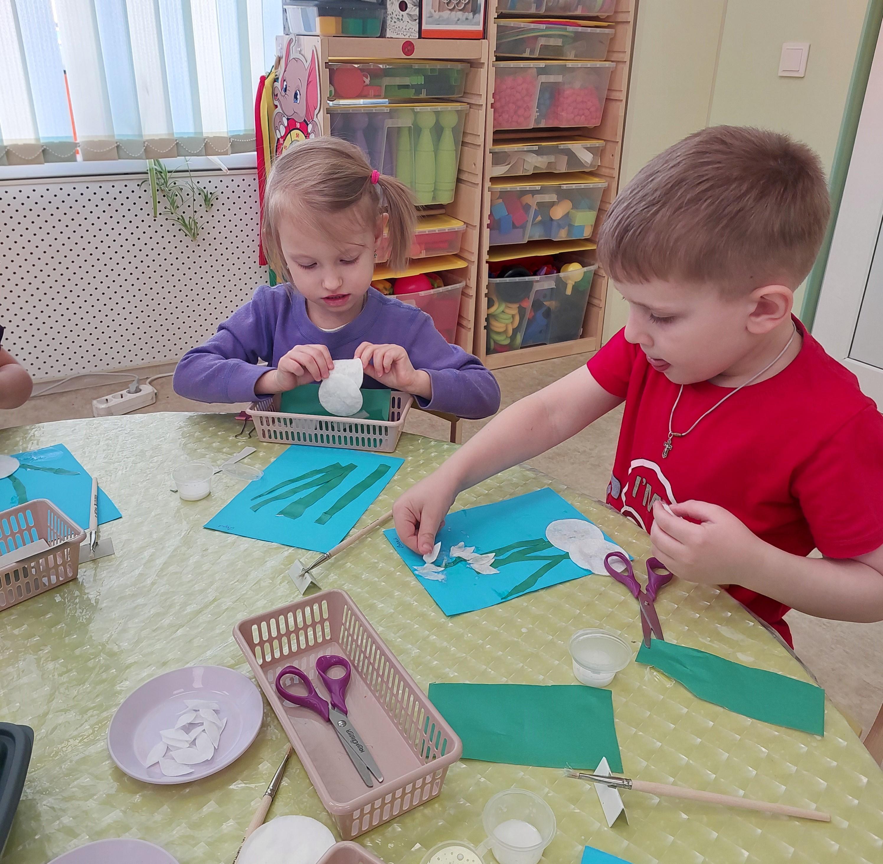 На неделе, посвященной лексической теме «Первоцветы», ребята сделали интересную и очень красивую аппликацию из ватных дисков. Получились настоящие подснежники на проталинке — одни из первых символов весны!