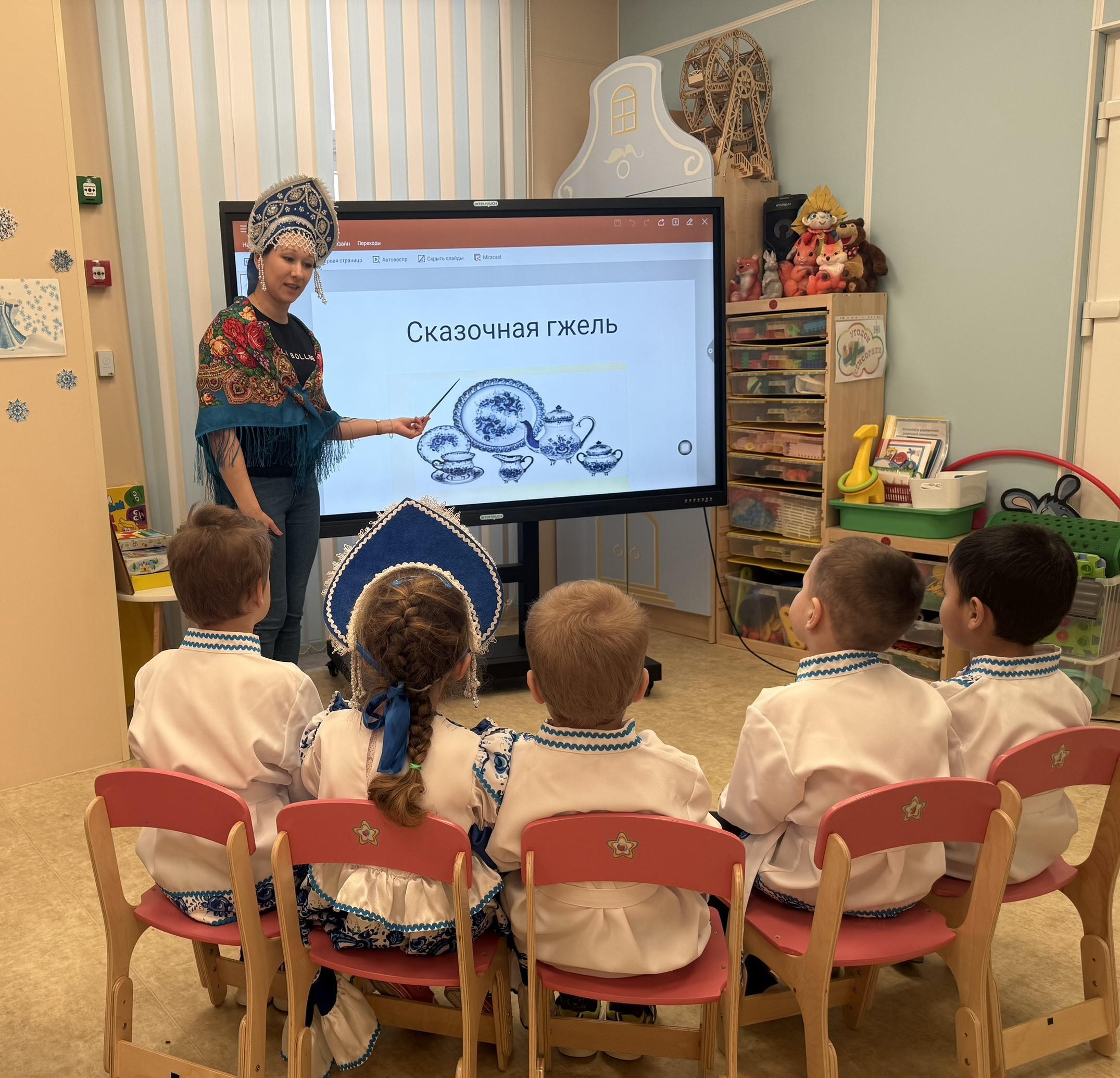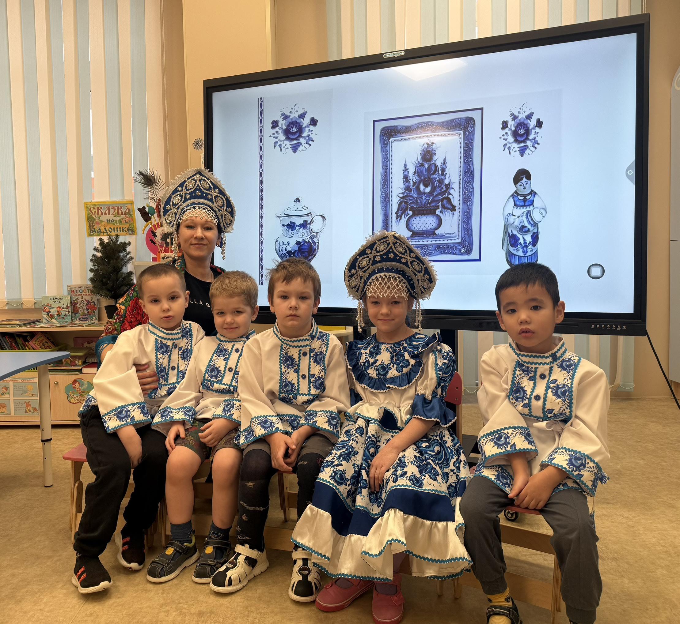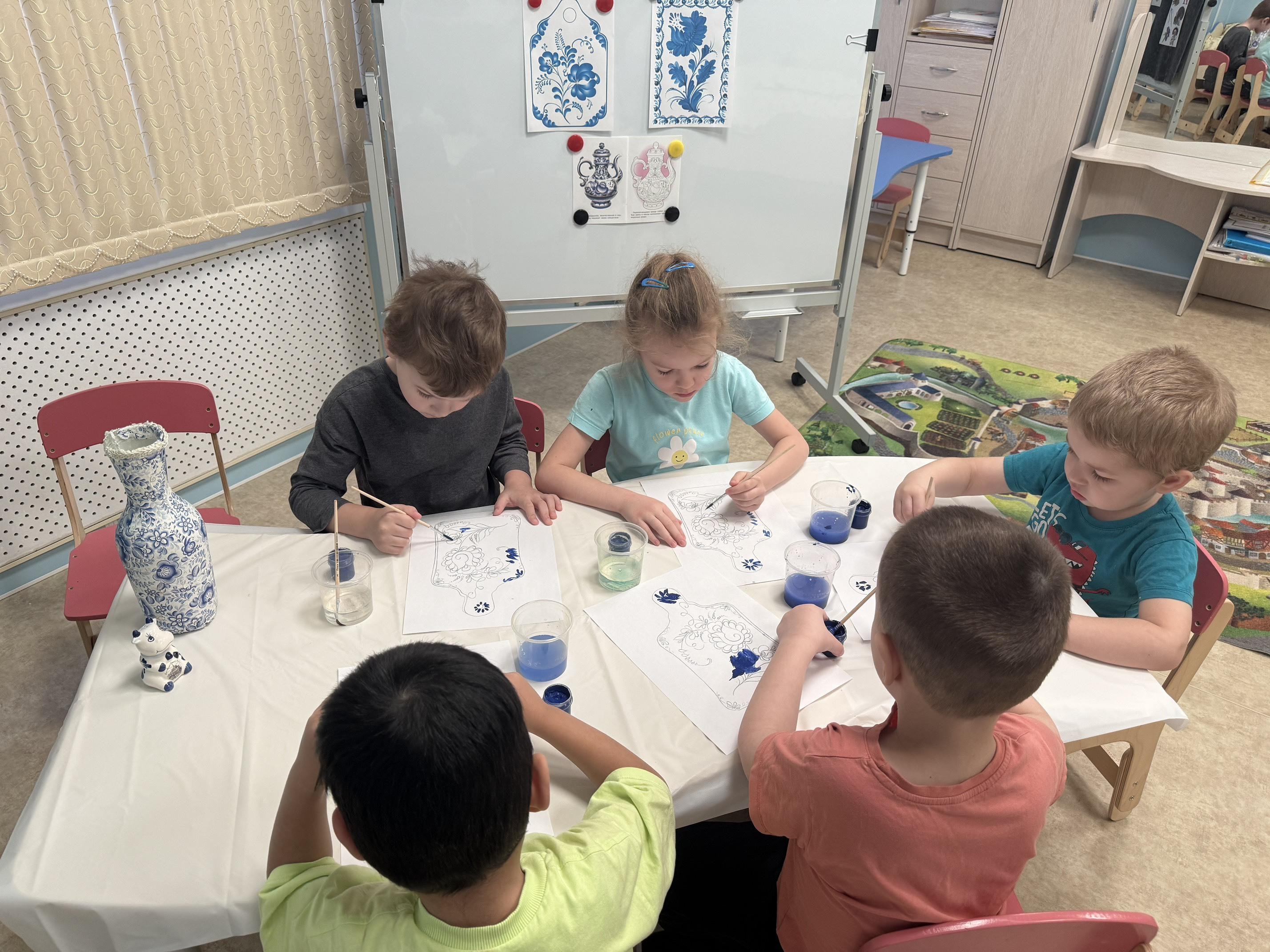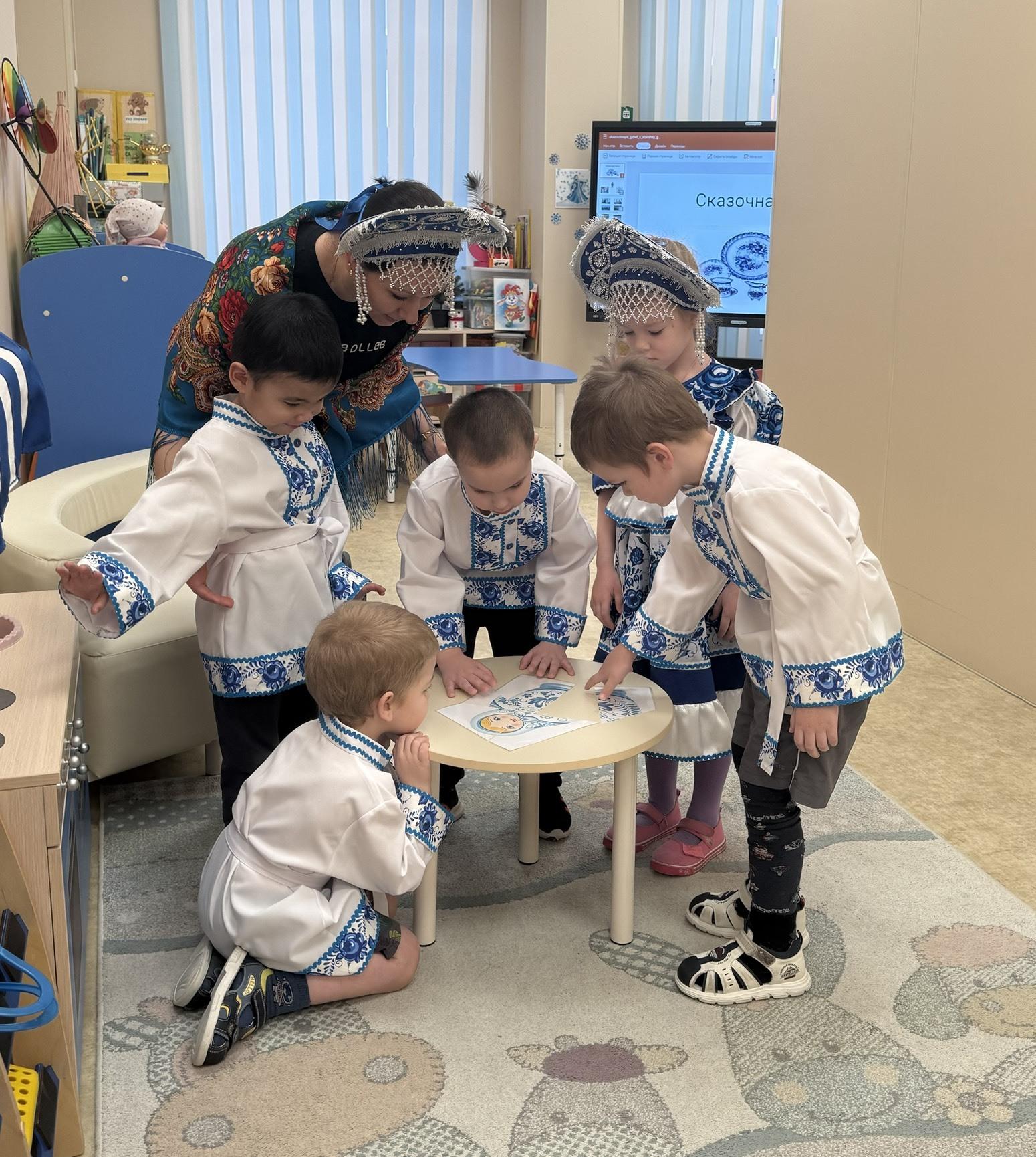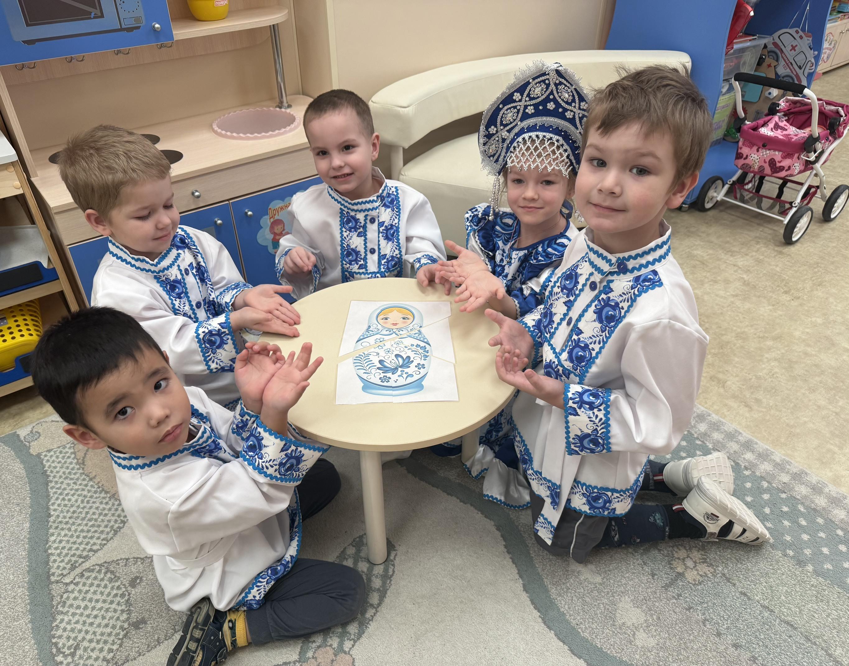 Ребята из группы «Цветочная» окунулись в мир сказочной гжели, посмотрели фильм, рассматривали иллюстрации гжельской керамики, «Гжельский фарфор». Поиграли в дидактическую игру «Собери матрёшку», примерили красивые наряды и расписали доски гжельской росписью. Ребятам было очень интересно и любопытно посмотреть и узнать, что посуда может быть такой красивой и волшебной.